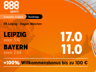 Passenden zum Spitzenspiel der Bundesliga hält 888Sport einen beliebten Quoten Boost bereit. Für „RB Leipzig gewinnt“ gibt’s bei 888Sport eine MEGA Quote von 17,00 anstelle der klassischen 3,10. Insofern „Bayern gewinnt“ winkt eine Quote von 11,00 anstatt der marktüblichen 2,02 (Quotenstand: 31.03.2021 11:55 Uhr). Da der Boost nur an Neukunden gerichtet ist, können diese sich weiterhin den 888Sport Ersteinzahlungsbonus von 100% bis zu 100€ sichern.