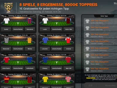 Wie der Name schon erahnen lässt, gilt es im „Up for 8“ Tippspiel acht Begegnungen in den europäischen Spitzenligen vorherzusagen. Die Ansetzungen richten sich je nach dem Bekanntheitsgrad der jeweiligen Wettbewerbe. Zu tippen sind klassische Drei-Wege-Wetten (Sieg, Unentschieden, Niederlage). Die Begegnungen sind vor dem Beginn des ersten Matches zu tippen. Pro Woche kann nur eine Tippabgabe bewerkstelligt werden. Sollten die Tipps einmal abgegeben werden, sind diese als fix zu betrachten.
