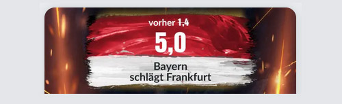 Maximal 5 € werden mit der gepimpten Quote von 5,00 vergütet. Im Mitgliederbereich angekommen, besteht die Aufgabe darin, sich für den Frankfurt Bayern Quoten Boost anzumelden. Anschließend wird das Wettkonto aufgeladen und 5 € als Pre Play Einzelwette auf Sieg Bayern gesetzt.