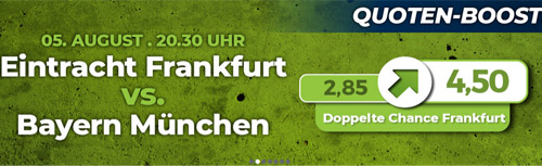Zum Start der neuen Bundesliga Saison hat Happybet gleich noch ein zweites, heißes Eisen im Feuer und pusht die Bundesliga Quote zum Eröffnungsspiel Frankfurt vs. Bayern. Für die „Doppelte Chance Wetten 1 & X (Frankfurt gewinnt & Unentschieden)“ vergibt Happybet eine geboostete Quote von 4,50 statt regulär 2,85. Der Maximaleinsatz für einen teilnahmeberechtigten Wettschein beträgt 10 €!