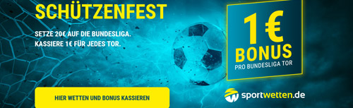 Für jedes Bundesliga Tor am ersten Matchday gewährt Sportwetten.de ein Wettguthaben in Höhe von 1 Euro. Das Wettguthaben ist einmal binnen 14 Tagen zu einer Mindestquote von 2,00 umzusetzen.