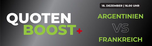 Der Argentinien Frankreich Quoten Boost ist sowohl für Neu- als auch Bestandskunden angedacht. Einfach bei Happybet einloggen oder registrieren und schon kann es losgehen. Der Wettanbieter hält für den Markt „Unentschieden (X)“ eine Quote von 4,00 statt vorher 3,00 bereit. Sollte Messi & Mbappe zusätzlich noch treffen wird die Quote sogar von 4,00 auf 6,00 hochgeschraubt! (Quotenstand: 16. Dezember 2022, 13:47 Uhr). Maximal 10 € werden mit der erhöhten Quote verrechnet.