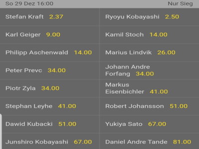 Ob Kamil Stoch allerdings bei der Vierschanzentournee für Wetten auf den Gesamtsieg in Frage kommt, muss dennoch angezweifelt werden, da mit Kobayashi und Kraft zwei Athleten mittlerweile mehr Power vom Schanzentisch entwickeln können und in Normalform weiter springen als der Routinier aus Zakopane.