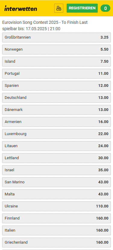 ESC Wetten für den letzten Platz sind besonders beliebt