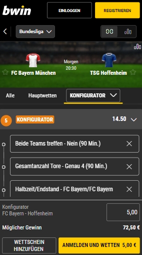 Auch Bwin ist ein etablierter Player am Sportwetten Markt, der mit einem Wett-Konfigurator dienen kann. Er ist für mehrere Sportarten verfügbar. Dabei lassen sich maximal zehn Wettmöglichkeiten eines Spiels zum Wettschein hinzufügen.