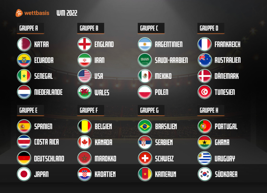 Hier gibt es alle Infos zu den acht WM Gruppen A bis H: Teams, Spiele, Termine, Tabellen und Ergebnisse. Plus: Die WM 2022 Gruppen Wettquoten für den Einzug ins Achtelfinale, den Gruppensieg und das Ausscheiden.