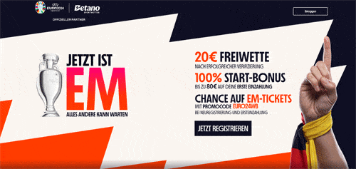Als offizieller Sponsor der EURO 2024 geizt Betano wahrlich nicht mit EM Aktionen. Neukunden können einem 100 % Bonus bis 80 € und eine 20 € Freiwette mit dem Betano Bonus Code BETMAX absahnen. Als weiteren Schritt zur EM Gratiswette muss der User noch die Verifizierung erledigen.