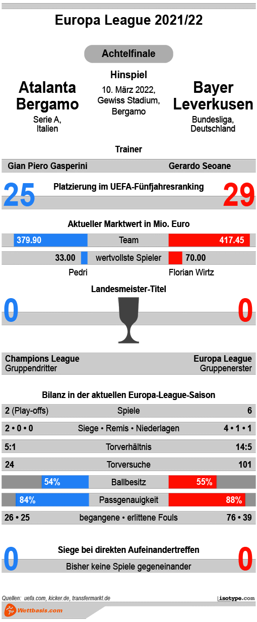 In unseren Augen ist es aber sinnvoller, die jüngsten Formkurven der Mannschaften miteinander zu vergleichen. Bayer spielt bislang ein sehr erfolgreiches Jahr 2022 mit vielen (offensiven) Ausschlägen nach oben. Die Bergamasken hingegen mussten zuletzt in der Serie A Federn lassen. Insbesondere im Spiel nach vorne läuft nicht wirklich viel zusammen.
