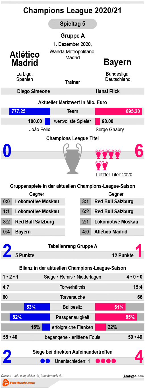 Doch viel Spannung gibt die Partie vorab nicht her – schlicht weil die Bayern längst vorzeitig qualifiziert sind und auch den Gruppensieg schon in der Tasche haben. Spannend gestaltet sich bloß die Frage, ob Atletico Rang zwei erreichen wird. Die Rojiblancos müssen die Partie eigentlich unbedingt gewinnen.
