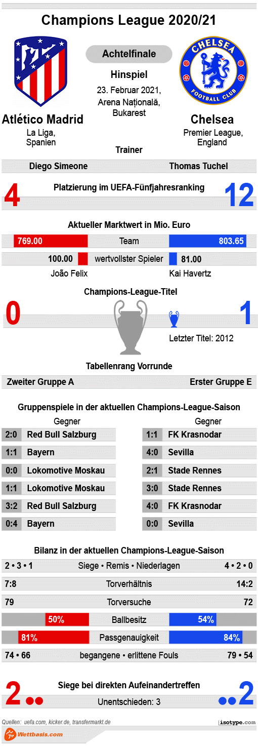 Angesichts der Bilanz von nur zwei Siegen aus den letzten K.-o.-Auswärtsspielen bei Vertretern von La Liga dürften dabei auch die Blues mit dem torlosen Remis zunächst sehr gut leben können. Immerhin scheiterte Chelsea zuletzt drei Mal in Serie im Achtelfinale. Zumindest aber insgesamt kann sich die Auswärtsbilanz der Londoner sehen lassen: Von den letzten 14 europäischen Auswärtsspielen haben die Blues lediglich eine einzige Partie verloren (zehn Siege, drei Remis).