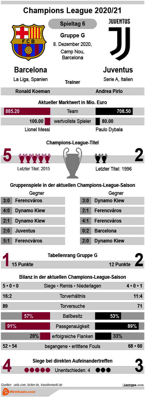 Finale um den Gruppensieg in Gruppe G der Champions League: Der FC Barcelona empfängt am Dienstagabend Juventus zum finalen Topspiel, nur mit einem Sieg können die Italiener noch an den Katalanen vorbeiziehen und sich Platz 1 in der Gruppe schnappen.