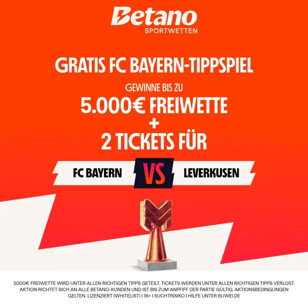 Mit dem Betano Master Bayern – Leverkusen Tickets & Freebet gewinnen (bis 18.10)