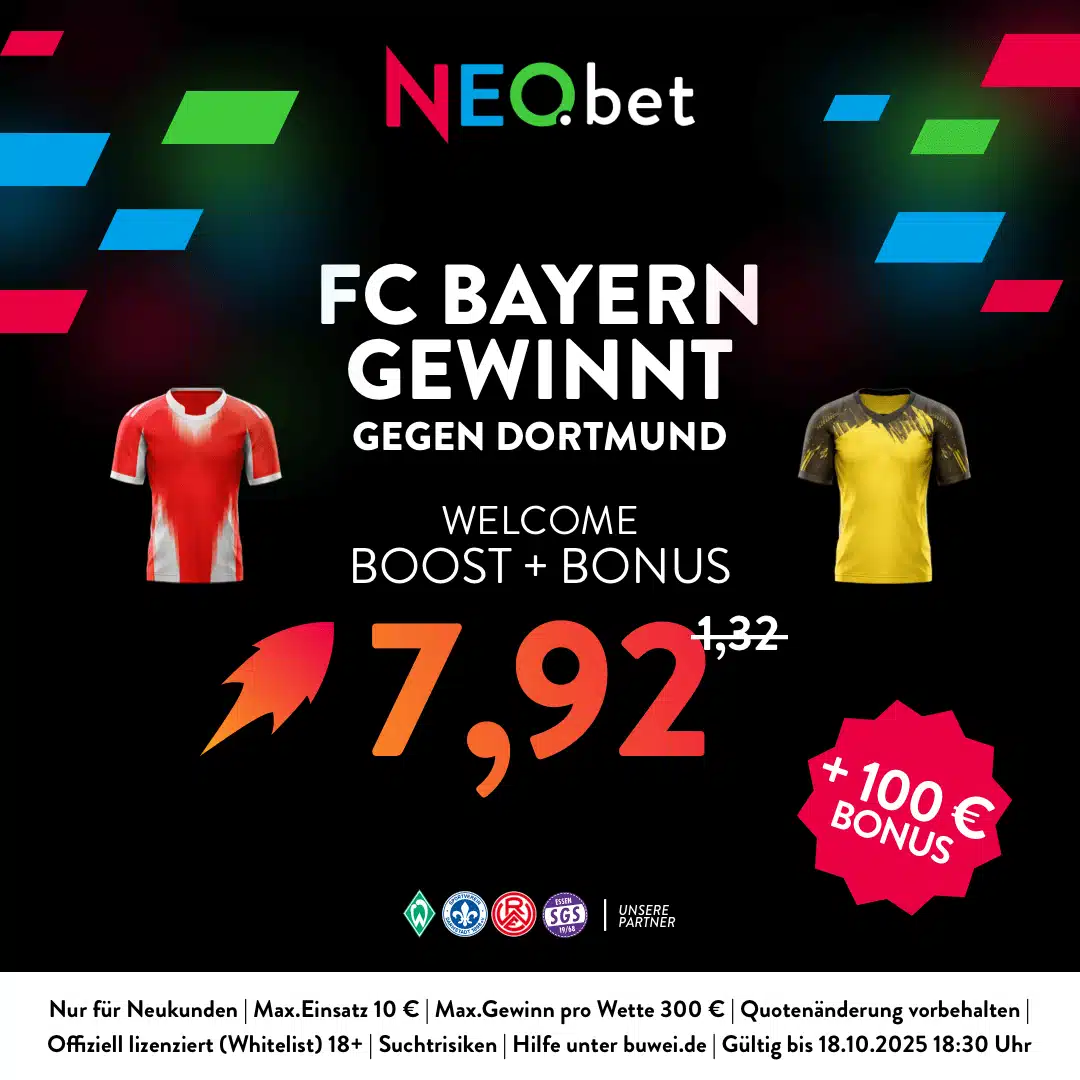 Bei diversen Wettanbietern gibt es pünktlich zum Topspiel an der Isar zwischen Bayern und Dortmund erhöhte Quoten abzustauben. Neukunden können beispielsweise vom 500% NEO.bet Boost zu FCB vs. BVB profitieren und anstatt einer 1.32 auf den Heimsieg eine satte 7.92 mit einem Maximaleinsatz von 10€ anspielen. Alle weiteren Infos dazu findet ihr in der Schritt-für-Schritt-Anleitung direkt über dem Inhaltsverzeichnis.