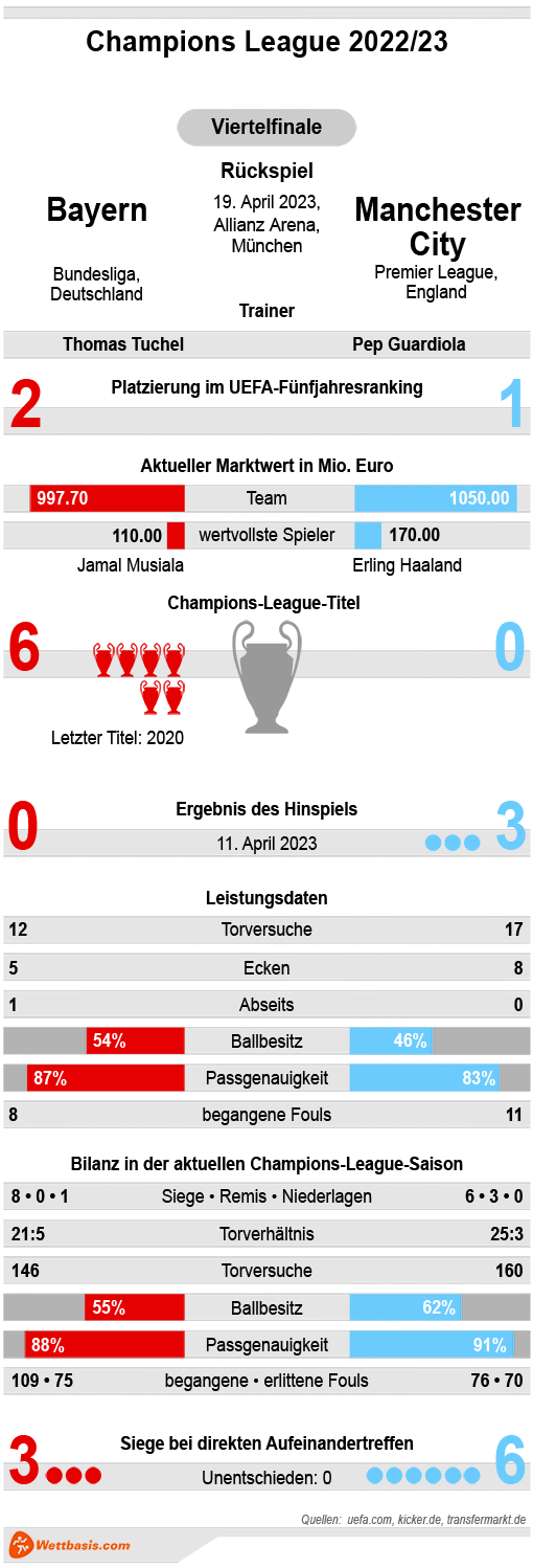 Unser Bayern - Manchester City Tipp im Quotenvergleich 19.04.2023 – 1/X/2
