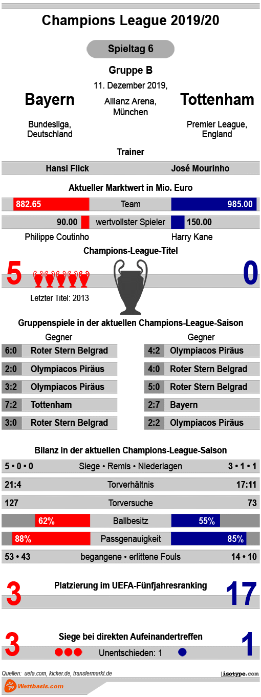 Auch statistisch gibt es kaum Bedenken, dass sich zwischen Bayern und Tottenham ein Tipp auf den Heimerfolg nicht auszahlen wird. 16 der letzten 17 Heimspiele in der Champions League-Gruppenphase konnten die Münchner für sich entscheiden. In der Allianz Arena ist man demnach seit Dezember 2013 in Vorrundenspielen in der Königsklasse ungeschlagen.