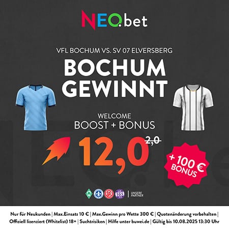 Erhöhte variable Quote von 12,0 anstatt 2,0 für Sieg Bochum am 2. Spieltag der 2. Bundesliga mit dem unglaublichen 500% Boost von NEO.bet