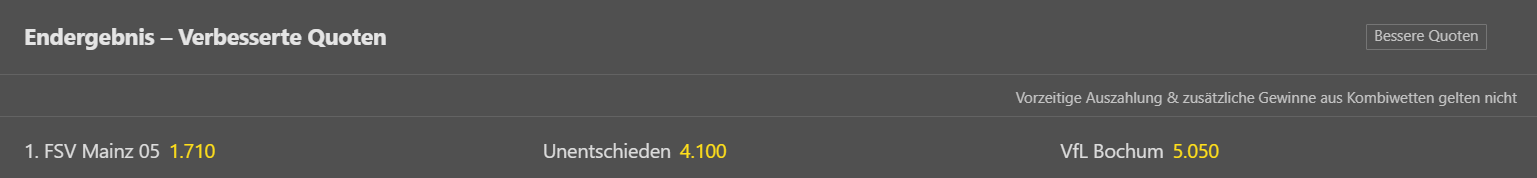 | Mainz vs. Bochum | 1 (erhöhte Quote) zu 1.71 | |