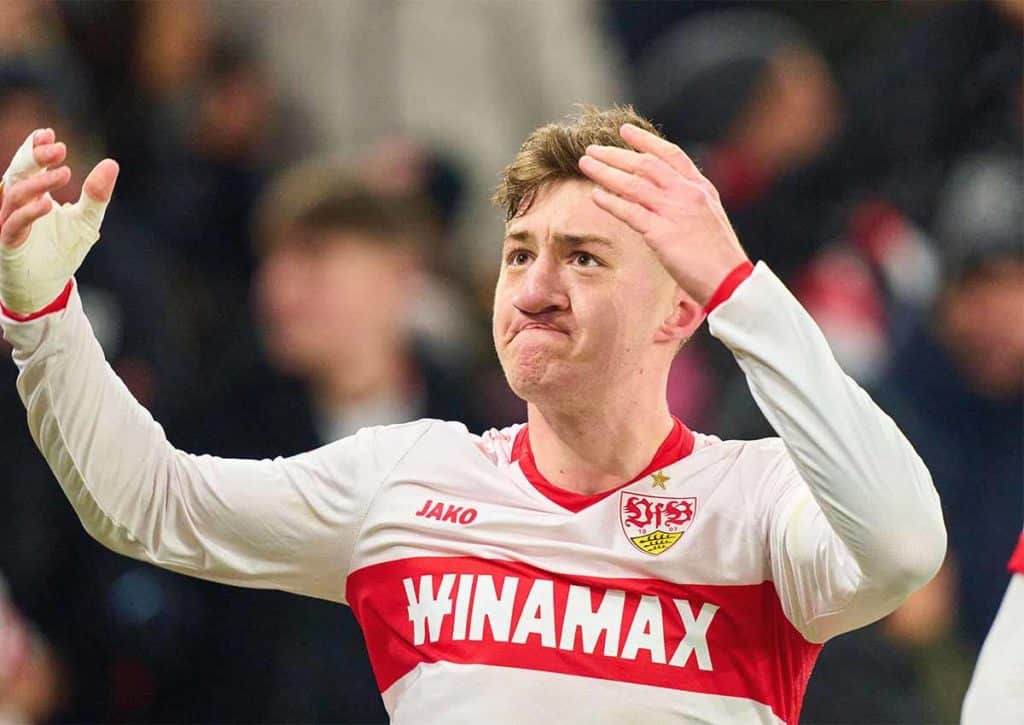 Unsere KI BETSiE traut Vizemeister Stuttgart (im Bild: Angelo Stiller) keinen Sieg gegen Leverkusen zu. (© ddp media GmbH / Alamy Stock Photo)