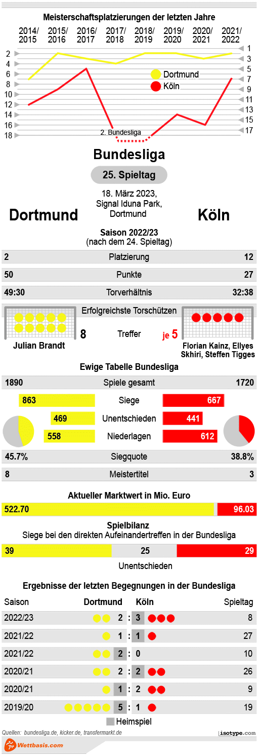 Diesen Ausrutscher im Revierderby gilt es nun auszumerzen und vor heimischer Kulisse den Druck im Rennen um die Meisterschaft auf den FC Bayern weiter hochzuhalten. Die Chancen auf den nächsten Dreier stehen dabei ziemlich gut, denn die Buchmacher treffen vor dem Samstagabendspiel Dortmund gegen Köln einstimmig die Prognose, dass der Heimsieg der wahrscheinlichste Ausgang ist. Kein Wunder, immerhin reisen die Domstädter in einer schwachen Verfassung zum Tabellenzweiten.