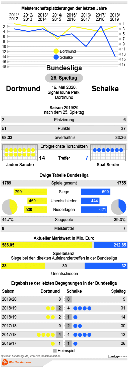 Dies ändert jedoch nichts an der Tatsache, dass die Dortmund gegen Schalke Prognose vieler Experten in Richtung der Heimmannschaft ausschlägt. Kein Wunder, denn immerhin geht es für die Borussia an den neun verbleibenden Spieltagen noch um die Meisterschaft, während die Königsblauen in erster Linie dankbar dafür sein dürften, dass die Spielzeit überhaupt fortgesetzt wird. Im Falle eines Abbruchs hätte es die Gelsenkirchener finanziell nämlich so hart getroffen wie kaum einen anderen Erstligisten.