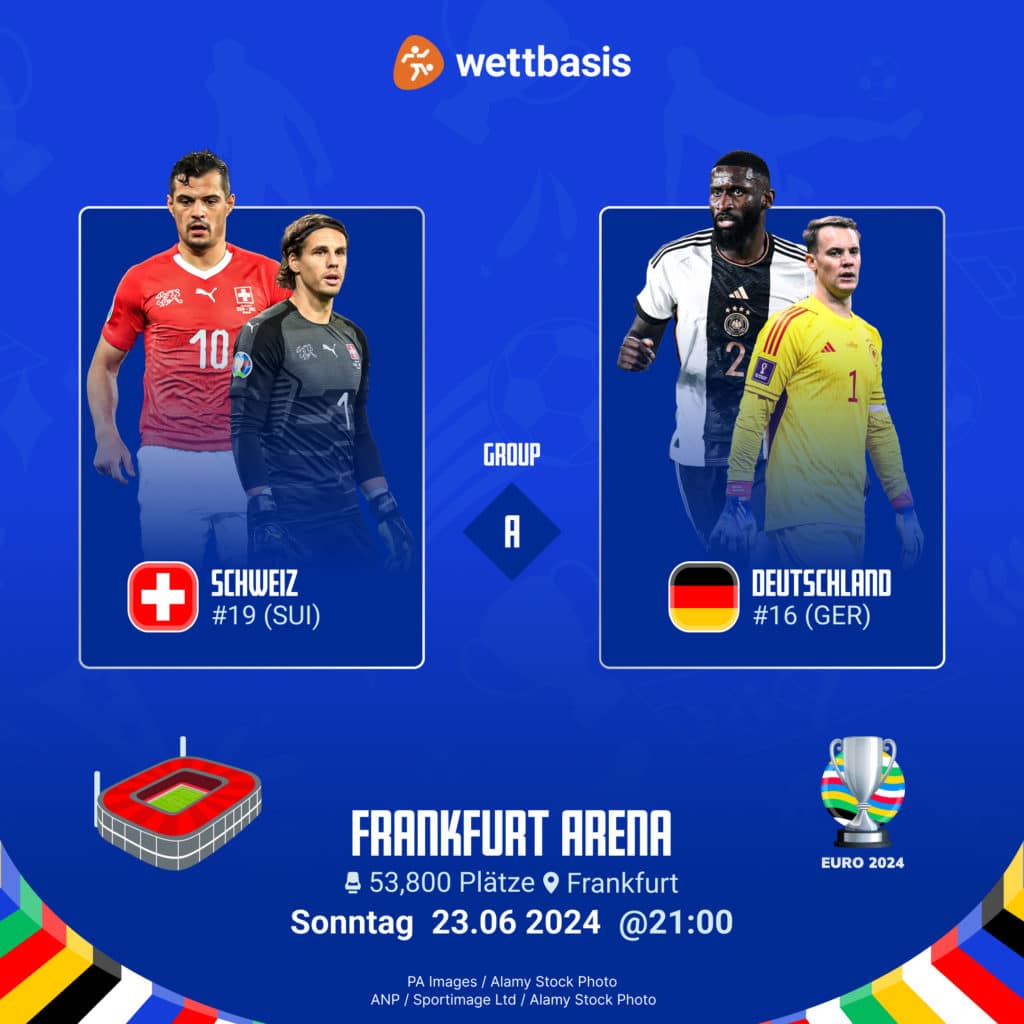 Wie die Buchmacher die Chancen von Deutschland beurteilen, klärt ihr zudem fix mit einem Klick auf die EM 2024 Quoten ab! Im kommenden Match gegen die Schweiz würde obendrein schon ein Remis zur Verteidigung des ersten Platzes in der Gruppe reichen.