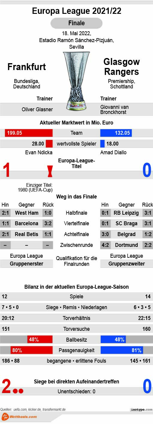 Vor dieser Kampagne in der Europa League hätten wir nicht zwingend darauf gewettet, dass schlussendlich Frankfurt und die Rangers im Endspiel stehen würden. Die Eintracht hatte auf dem Weg dahin große Gegner wie Fenerbahce Istanbul, Olympiakos Piräus, Betis Sevilla, den FC Barcelona oder West Ham United eliminiert. Wenn man sich gegen derartige Kontrahenten durchsetzt, dann darf im Duell Frankfurt gegen die Glasgow Rangers durchaus eine Prognose auf den Pokalsieg der Deutschen gewagt werden.