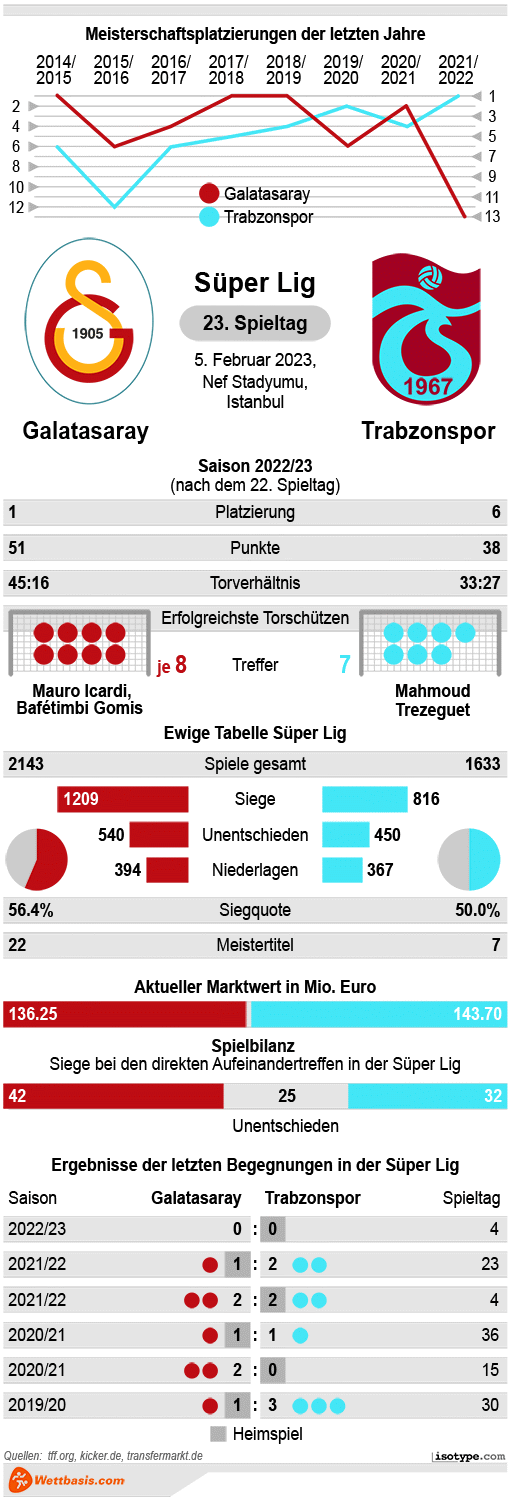In den zehn Heimspielen der laufenden Ligasaison holte Galatasaray bislang schon 25 Punkte. Mit einer Bilanz von 8-1-1 sind die Löwen statistisch gesehen das drittstärkste Heimteam im türkischen Oberhaus. Im Schnitt erzielte Galatasaray in den zehn Begegnungen im Nef Stadion 2,10 Tore pro Ligaspiel. Gut möglich, dass daran auch gegen Trabzonspor angeknüpft wird.