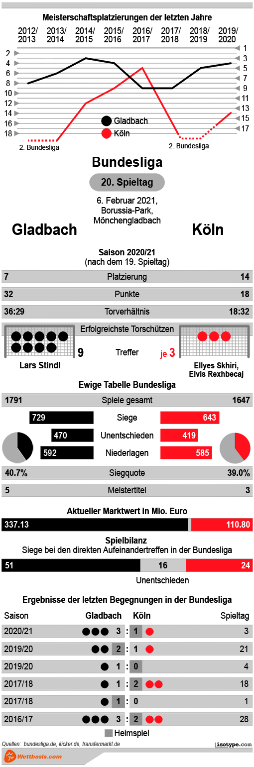 In der Bundesliga hat Gladbach mit 51 von 91 Spielen deutlich mehr als die Hälfte gewonnen. In der Bundesliga-Geschichte hat die Borussia gegen keinen Gegner häufiger die Oberhand behalten. Zuletzt gab es drei Derbysiege in Serie für Mönchengladbach. Im Hinspiel siegte das Team von Marco Rose nach Treffern von Alassane Plea, Stefan Lainer und Lars Stindl mit 3:1. Elvin Rexhbecaj war für Köln erfolgreich.