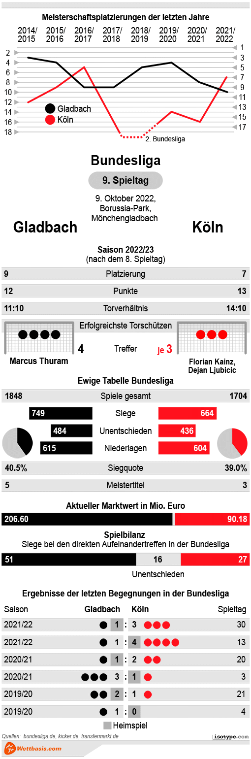 Insgesamt 128 Mal hat das Rheinische Derby zwischen Gladbach und Köln bislang stattgefunden und mit 60 Siegen führt die Borussia den direkten Vergleich an. Zuletzt konnte der Effzeh jedoch drei Siege in Serie verbuchen und 2021/22 erstmals seit der Saison 1989/90 wieder Hin- und Rückspiel im Ligabetrieb gegen die Fohlen gewinnen.