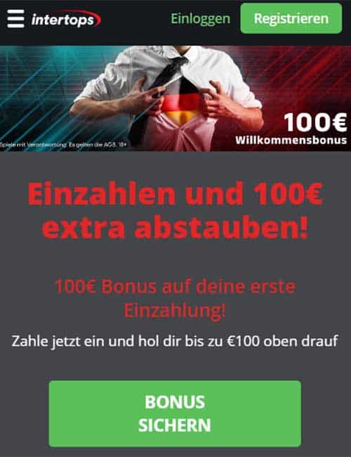 Intertops: 50% bis 100€ Willkommensbonus + 5€ Verifizierungs-Gratiswette!