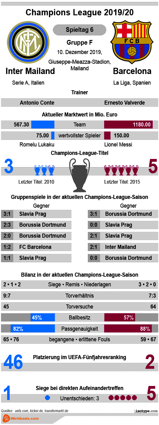 Dennoch ist Inter Mailand gegen Barcelona bei den Quoten der Buchmacher sehr eindeutig in der Favoritenrolle. Kein Wunder, denn die Mannen von Ernesto Valverde sind derzeit voll auf den Meisterschaftskampf in Spanien fokussiert und gedanklich sicher schon beim wegweisenden Clásico am 18. Dezember.