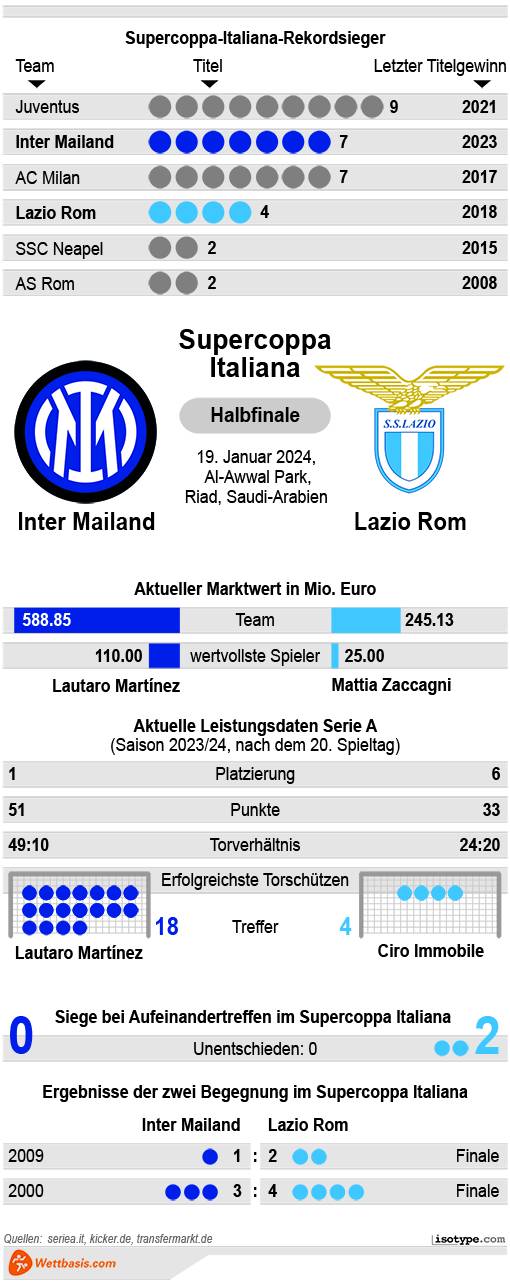 Am Papier ist Inter klar überlegen. In der Serie A ist die Kluft auch enorm. Lazio scheint aber gerade eine gewisse Renaissance durchzumachen. Dadurch sind Inter Mailand und Lazio Rom bei den Quoten wohl weiter getrennt, als es am Rasen tatsächlich sichtbar werden wird.