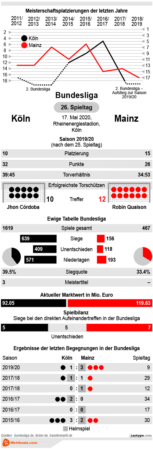 Der Aufschwung von Köln unter dem neuen Trainer Markus Gisdol sorgte vor der Unterbrechung dafür, dass die Mannschaft aus dem tiefsten Abstiegssumpf entkommen und sich auf Platz zehn vorarbeiten konnte. Das zeigt sich ebenso beim Blick auf die Bundesliga-Tabelle: Mit nun 32 Punkten hat Köln schon zehn Punkte Vorsprung auf den Relegationsplatz und kann im Gegensatz zum Gegner aus Mainz schon fast sicher mit dem Klassenerhalt planen.