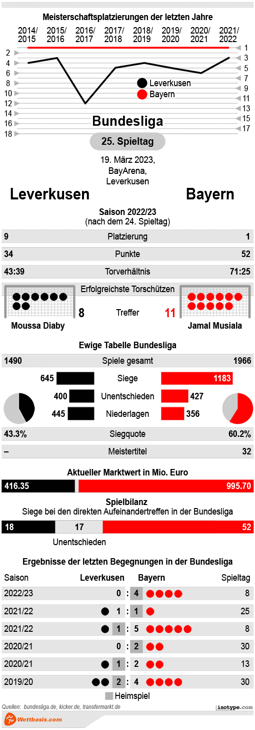 Überhaupt war die BayArena zuletzt stets ein gutes Pflaster für den deutschen Rekordmeister, der bei vier seiner letzten fünf Gastspiele die vollen drei Punkte aus Leverkusen entführte – darunter in den letzten drei Auswärtsspielen in Serie. Entsprechend stimmig ist auch jetzt bei Leverkusen gegen Bayern die Prognose darauf, dass die Münchner ihre Tabellenführung im Fernduell mit Borussia Dortmund mit einem Dreier im Rheinland behaupten können.
