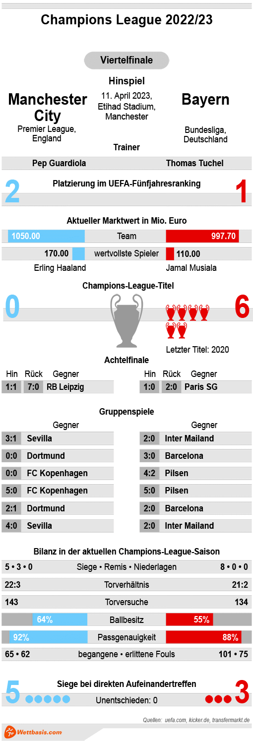 Da wir aber keinen rein statistisch- und formbezogenen Ansatz wählen und uns stattdessen der Manchester City vs. Bayern Prognose auch über eine analytische Herangehensweise nähern wollen, gibt es fraglos noch andere interessante sowie hilfreiche Aspekte, die Berücksichtigung finden werden.
