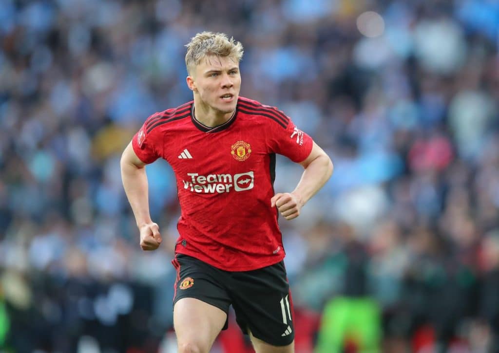 Muss United (im Bild: Rasmus Hojlund) zusehen, wie City im Wembley das Double holt? (© News Images LTD / Alamy Stock Photo) (Photo by Gareth Evans/News Images)