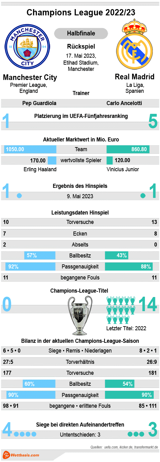 Für den spanischen Rekordmeister spricht, dass die Königlichen in acht von zehn Fällen, in denen es in einem K.-o.-Spiel in der Champions League zunächst ein Remis im Hinspiel gab, weitergekommen sind. Die Blancos bringen überdies eine gute Bilanz gegen englische Klubs mit, gegen die keines der letzten sieben Champions-League-Spiele verloren wurden (sechs Siege, ein Remis). Dennoch tendiert bei Manchester City gegen Real Madrid die Prognose der Buchmacher klar in Richtung der Sky Blues.