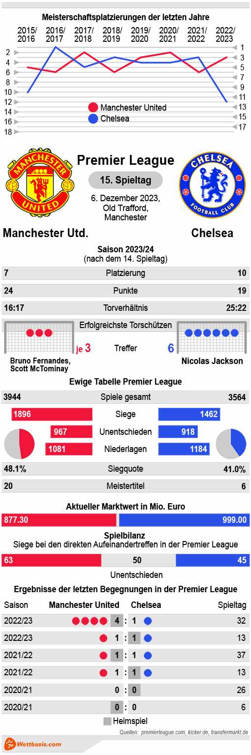Das Momentum liegt wohl eher beim Team von Trainer Maurizio Pochettino, das zuletzt sehr viele Tore erzielte und mit erfreulichen Ergebnissen gegen gute Kontrahenten Aufsehen erregte. Tabellarisch hat jedoch weiterhin der Manchester United Football Club die Nase vorne. Fünf Punkte beträgt der Vorsprung des Rekordmeisters auf den Champions League-Sieger von 2021 und das, obwohl die Blues im bisherigen Saisonverlauf sogar eine Niederlage weniger kassierten als die Red Devils, die noch kein einziges Remis in der Statistik stehen haben.