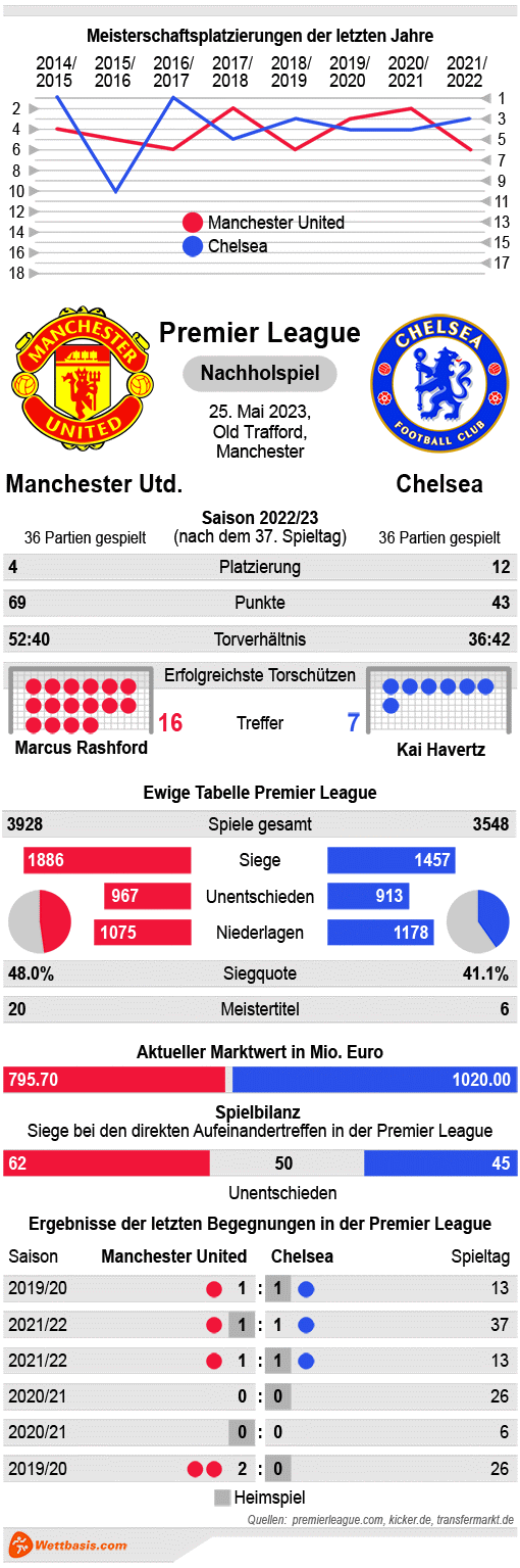 Manchester United benötigt noch einen Punkt für die fixe Qualifikation zur Champions League. Chelsea hingegen will die Saison nur irgendwie halbwegs solide beenden. Die Rollenverteilung erscheint deswegen komplett klar, alles spricht für die Gastgeber, die zuhause ohnehin sehr gute Leistungen zeigten.