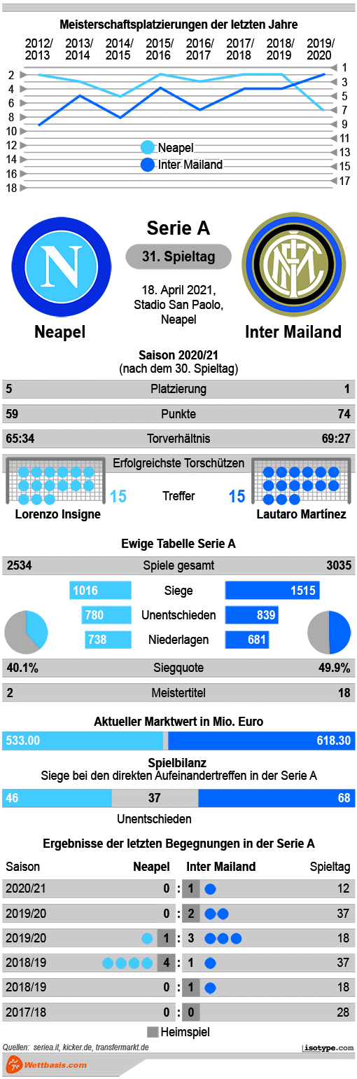 Ein Blick auf die letzten Spiele gegeneinander in der italienischen Serie A zeigt, dass Neapel nur eines der letzten sieben Ligaspiele gegen Inter Mailand gewonnen hat, zuletzt kassierte der SSC Neapel gar drei Niederlagen in Serie. Das Duell am Sonntag stellt ein Jubiläum dar – zum 150. Mal werden sich die beiden Teams in der Serie A gegenüberstehen.