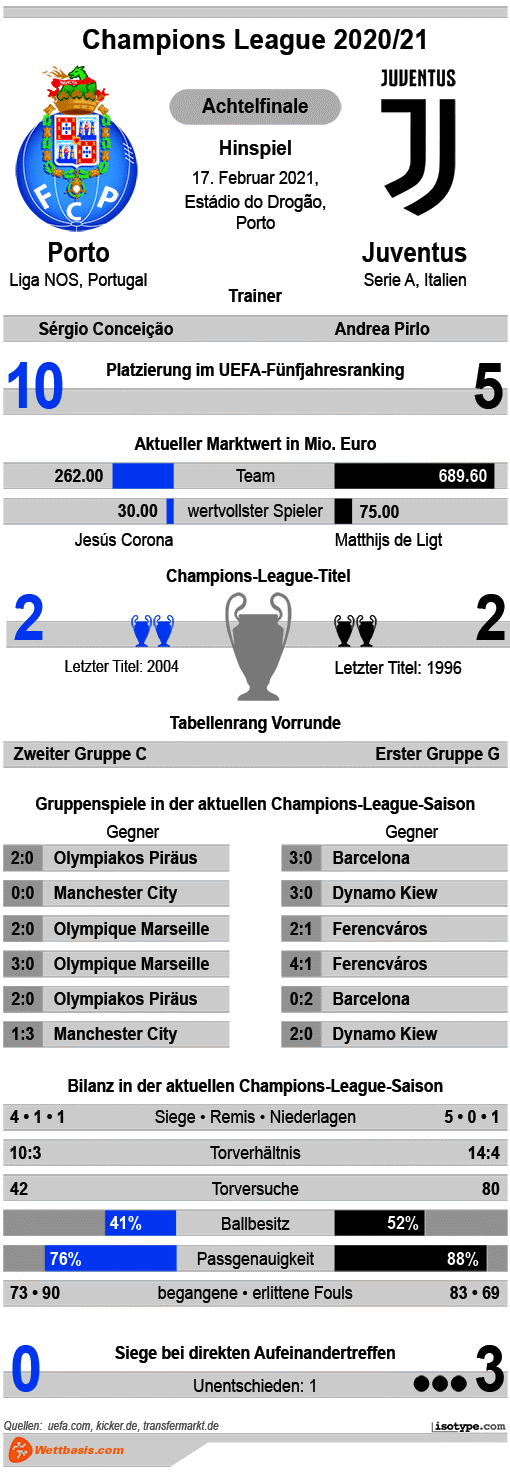 Gänzlich abschreiben darf man Juventus in der heimischen Meisterschaft noch nicht, trotzdem wird nun jeder weitere Misserfolg viel Gegenwind für Andrea Pirlo bedeuten. Umso wichtiger ist es, schnell wieder in die Spur zu finden und im Idealfall schon im Hinspiel im Estadio do Dragao die Weichen auf Viertelfinale stellen. Bei Porto gegen Juventus spricht für die Prognose auf die Gäste definitiv die Auswärtsbilanz der Alten Dame in den letzten Jahren. Fünf der letzten sechs Auswärtsspiele in der Königsklasse hat Juventus gewonnen, in den letzten acht Spielen gab es gar nur eine Niederlage zu verkraften.