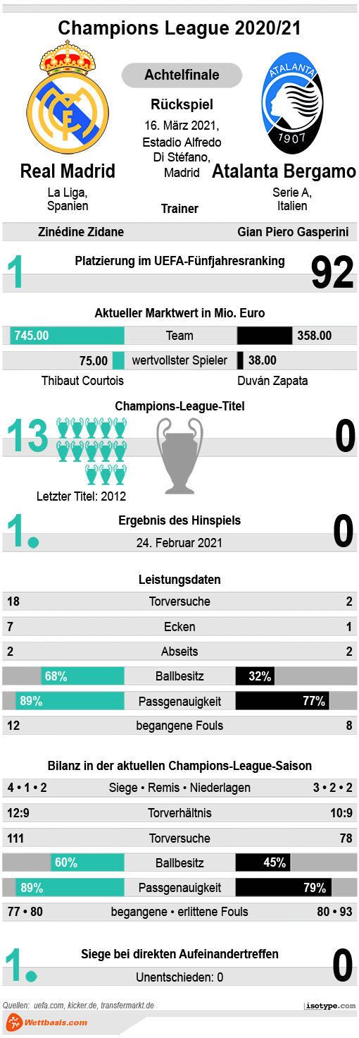 Real Madrid - Atalanta Bergamo Wettquoten im Vergleich 16.03.2021 – 1/X/2