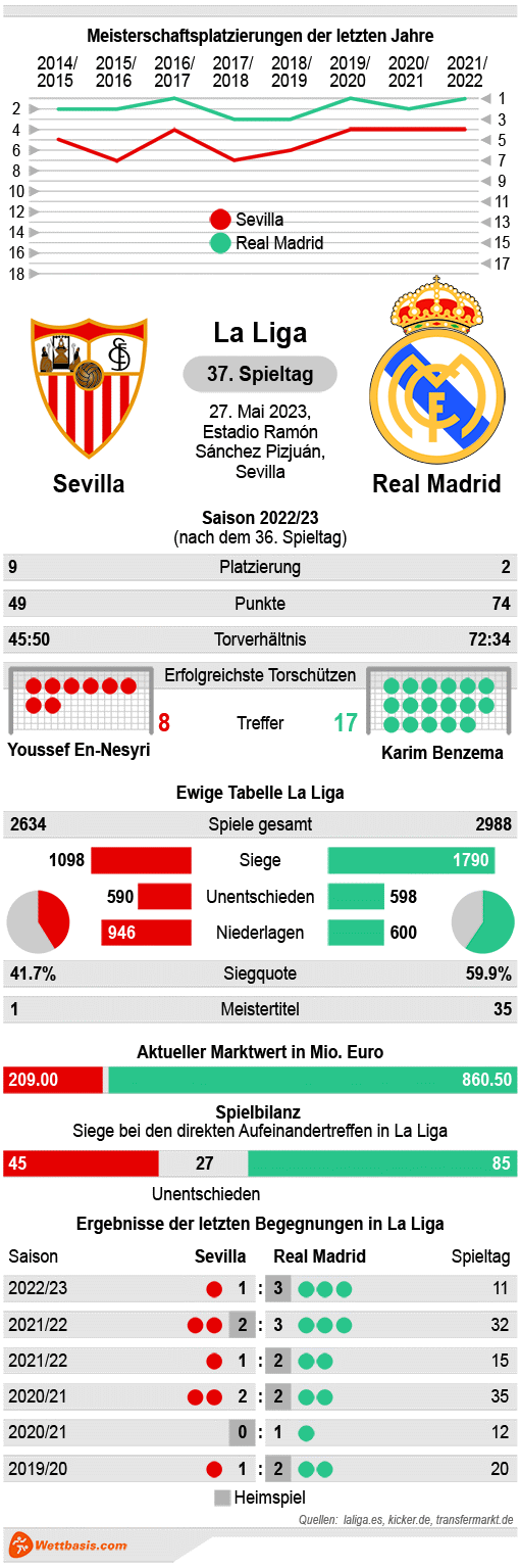 Trotzdem haben sich die Galaktischen, die immerhin das Copa del Rey-Finale gewinnen konnten, auf die Fahne geschrieben, die Saison 2022/23 versöhnlich zu beenden und bestenfalls vor dem Stadtrivalen Atletico im Klassement zu bleiben. Um genau das zu gewährleisten, braucht es am Samstagabend im Rahmen des vorletzten Spieltags im spanischen Oberhaus vermutlich einen Sieg in Andalusien. Vor der Begegnung Sevilla gegen Real Madrid bringt der Tipp auf den Gästedreier aber viel Risiko mit sich.