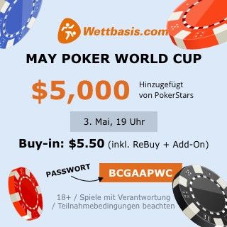 Sollten sie den heutigen Sonntag mal nutzen wollen, um ein Blick über den Tellerrand hinauszuwagen, empfehlen wir ihnen unserer Wettbasis May Poker World Cup. In Zusammenarbeit mit Pokerstars hat die Wettbasis ein Preisgeld von $5000 ausgelobt. Heute Abend ab 19:00 Uhr steigen die Qualifiers; nächste Woche schließlich das Endturnier.