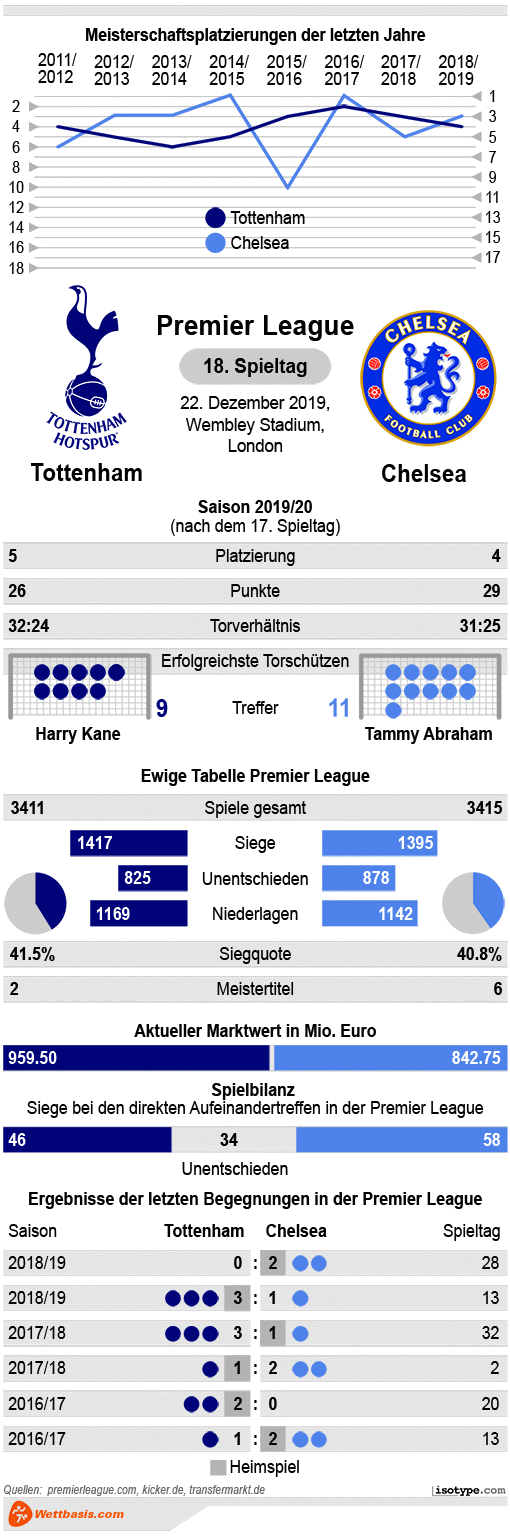 In der Premier League geht es zwischen Tottenham (Tabellenplatz 5, 26 Punkte) und Chelsea (Tabellenplatz 6, 50 Punkte) nun um den Champions League-Rang. Mit einem Sieg würde Tottenham Weihnachten auf Rang vier feiern.