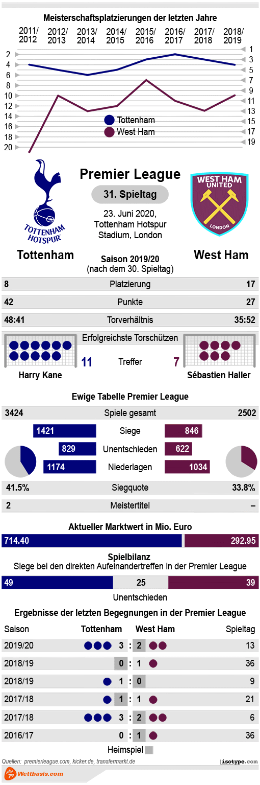 Weil der Abstiegskandidat darüber hinaus zum Re-Start zuhause gegen die Wolverhampton Wanderers verdientermaßen mit 0:2 den Kürzeren zog und außerdem ohnehin mit neun Niederlagen in 15 Auswärtsspielen zu den gern gesehen Gästen im englischen Oberhaus zählt, liegt vor dem Londoner Derby Tottenham gegen West Ham ein Tipp auf den Heimsieg der favorisierten Lilywhites definitiv nahe.
