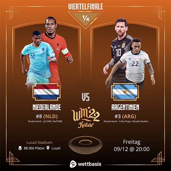 Am Abend kommt es zu einem echten WM-Klassiker. In der Neuauflage des WM-Endspiels von 1978 kommt es zur Begegnung zwischen Holland und Argentinien. Beide Teams haben keine geringeren Ziele, als den WM-Pokal aus Katar mit nach Hause zu nehmen. Den etwas stabileren Eindruck haben bis dato die Niederländer hinterlassen, die bei der WM 2022 in Katar noch ungeschlagen sind.
