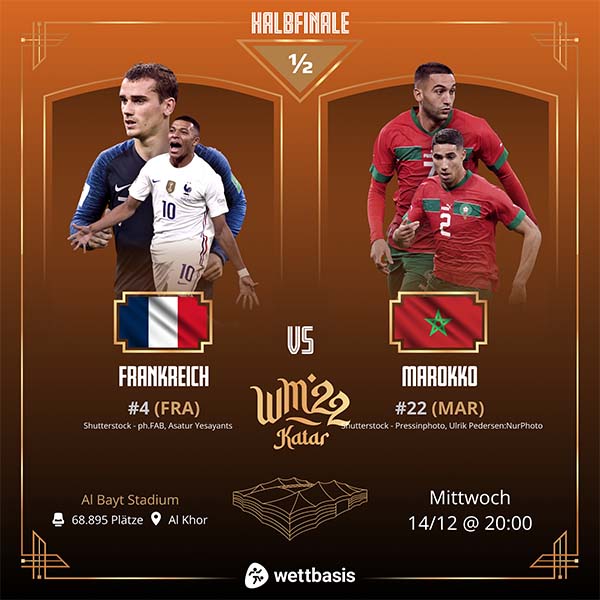 Am heutigen Mittwoch ist es aber so, dass die Mannschaft von Walid Regragui den wohl schwersten Gegner vor der Brust hat, den man bekommen kann. Mit der Equipe Tricolore wartet kein geringeres Team als der amtierende Weltmeister und Titelverteidiger. Wenn man aber am Sonntag den WM-Pokal in die Höhe recken will, dann muss man jeden Gegner schlagen können, was aber eben in der Vorschlussrunde für beide Kontrahenten gilt.