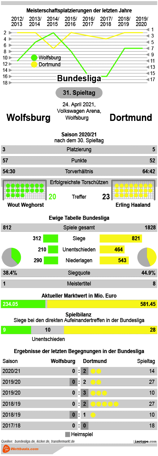 Insgesamt 51 Mal standen sich beide Teams bislang gegenüber und mit 29 Siegen führen die Schwarz-Gelben den direkten Vergleich deutlich an. Zuletzt hat der BVB seit elf Aufeinandertreffen nicht mehr gegen die Niedersachsen verloren (zehn Siege, ein Remis). Auch das Hinspiel ging an die Borussia, die inzwischen seit 757 Spielminuten ohne Gegentor gegen den VfL blieb.