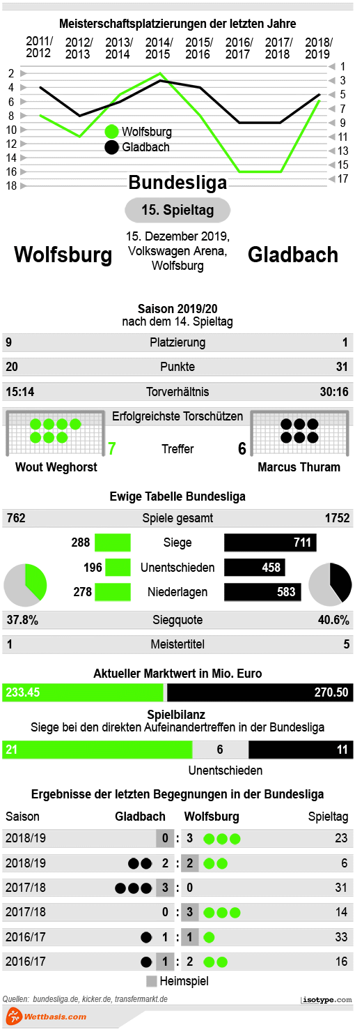 Überhaupt kassierten die Niedersachsen in den vergangenen sieben Duellen gegen die Borussia lediglich eine einzige Niederlage. In der vergangenen Spielzeit endete das Hinspiel in der Volkswagen Arena mit einem 2:2. Im Borussia Park siegte der Gast sogar mit 3:0. In vier der jüngsten zehn Aufeinandertreffen fielen maximal zwei Tore. So auch am Sonntag?